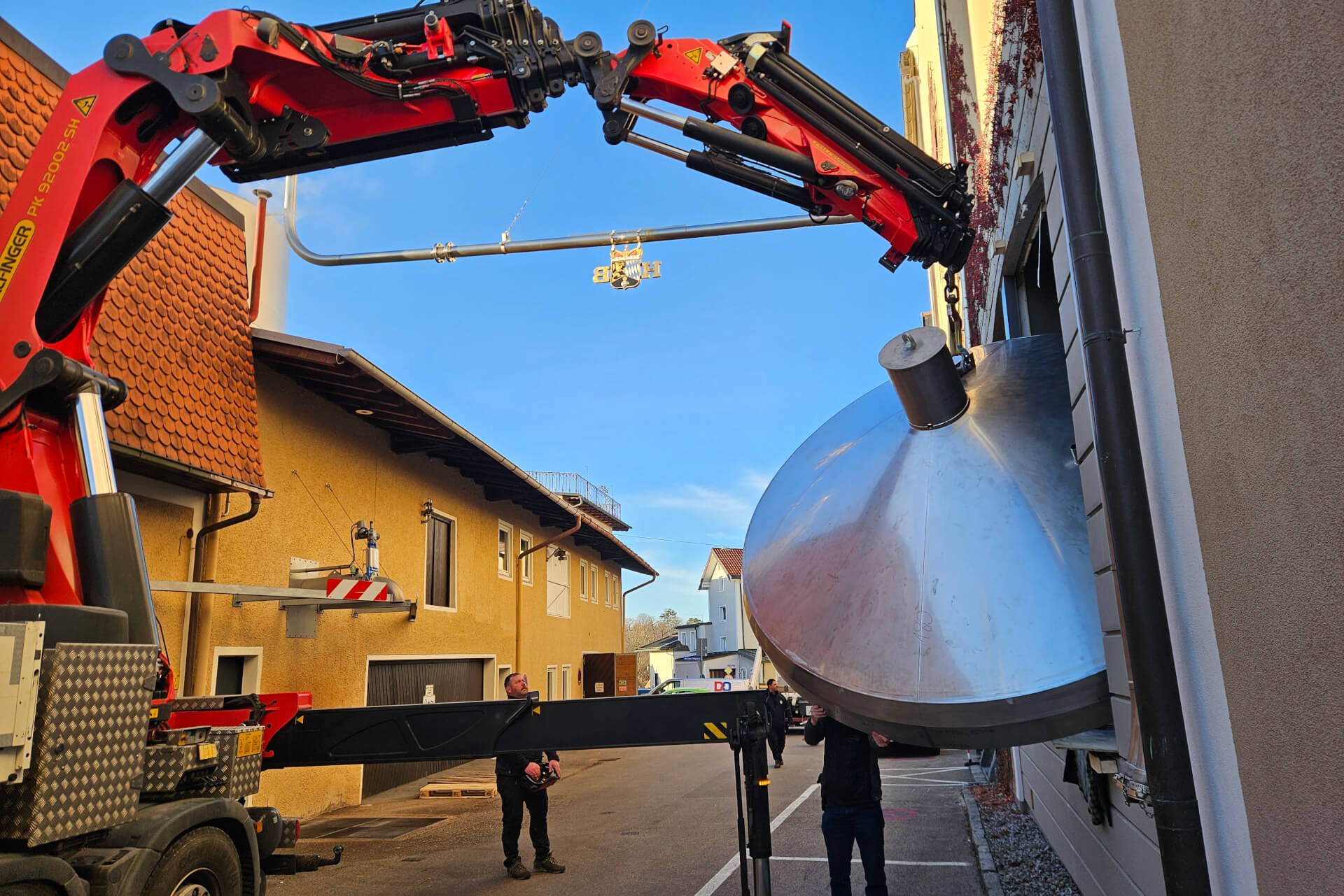 Die Erneuerung ist ein logistisch anspruchsvolles Unterfangen: Die Kupferhaube wird vorsichtig beiseite gehoben, Fenster werden geöffnet und der neue Bottich über ein spezielles Fördersystem millimetergenau in das Sudhaus eingebracht. Die Arbeiten werden bis Anfang Dezember durchgeführt.